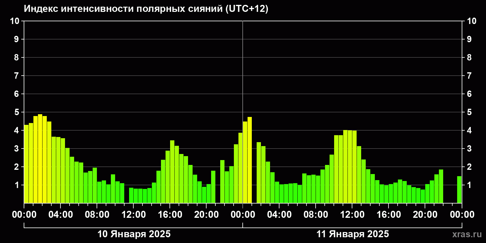 Изменения индекса интенсивности полярных сияний с 2025-01-10 по 2025-01-11 по местному времени