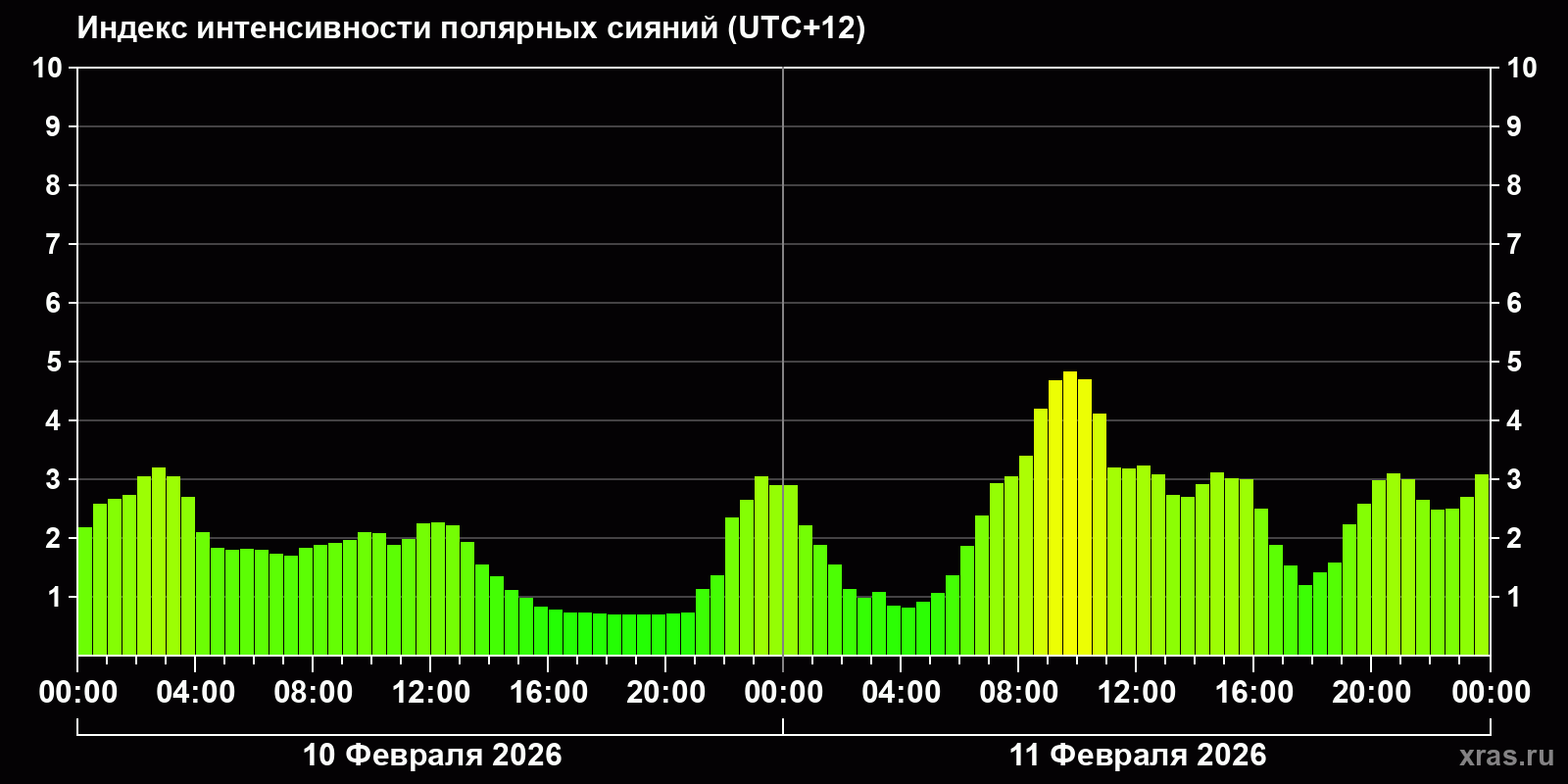 Изменения индекса интенсивности полярных сияний с 2026-02-10 по 2026-02-11 по местному времени