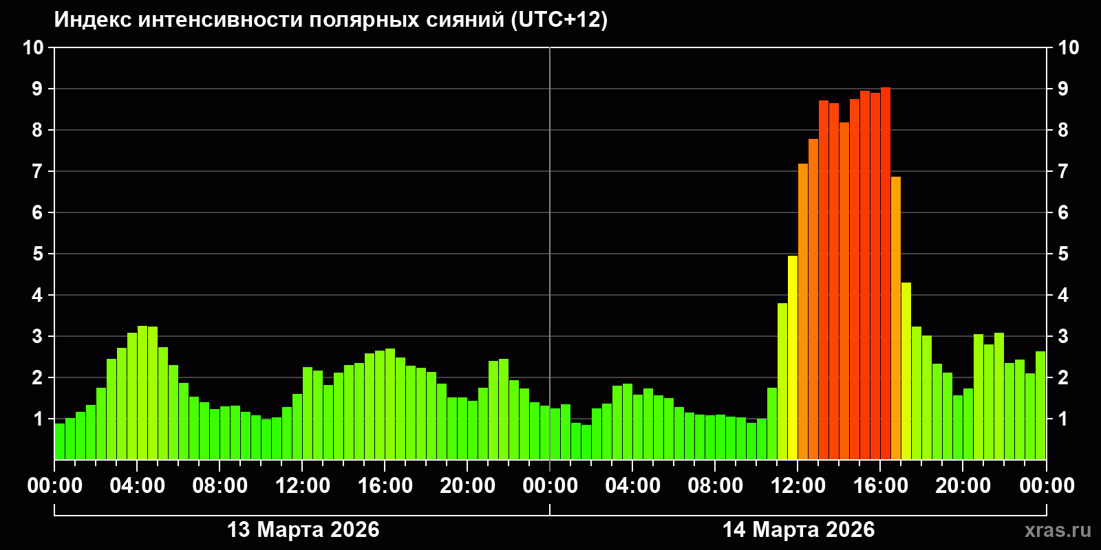 Изменения индекса интенсивности полярных сияний с 2026-03-13 по 2026-03-14 по местному времени