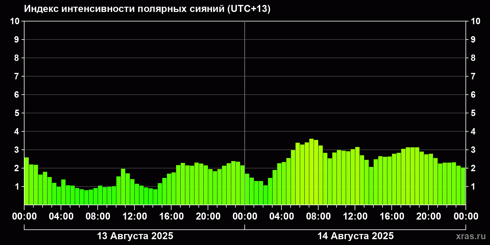 Изменения индекса интенсивности полярных сияний с 2025-08-13 по 2025-08-14 по местному времени