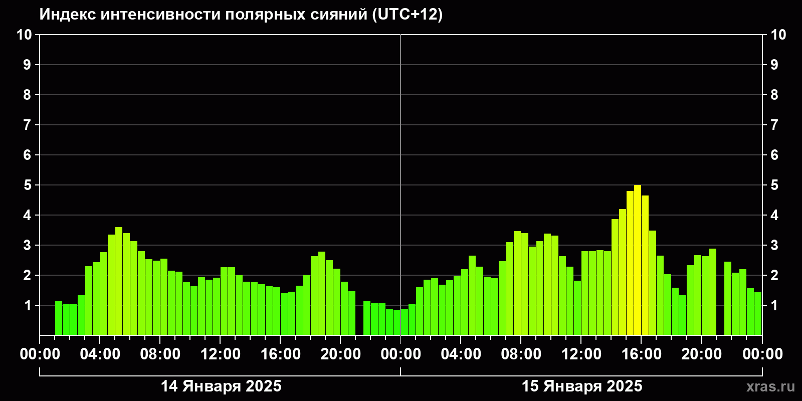 Изменения индекса интенсивности полярных сияний с 2025-01-14 по 2025-01-15 по местному времени