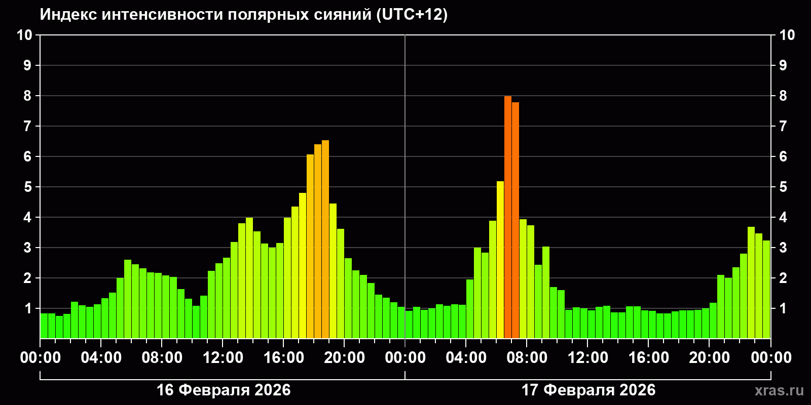 Изменения индекса интенсивности полярных сияний с 2026-02-16 по 2026-02-17 по местному времени