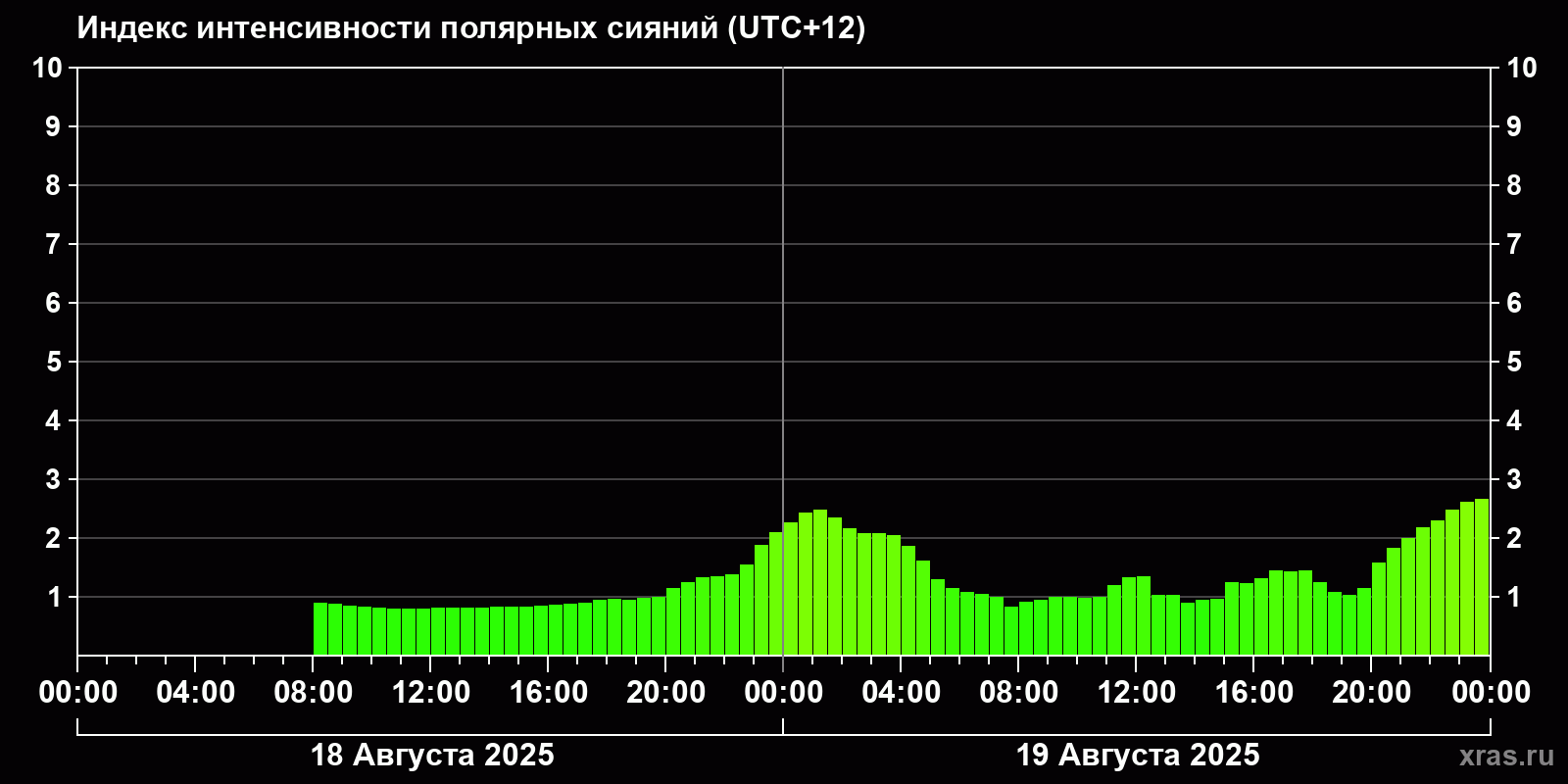 Изменения индекса интенсивности полярных сияний с 2025-08-19 по 2025-08-20 по местному времени
