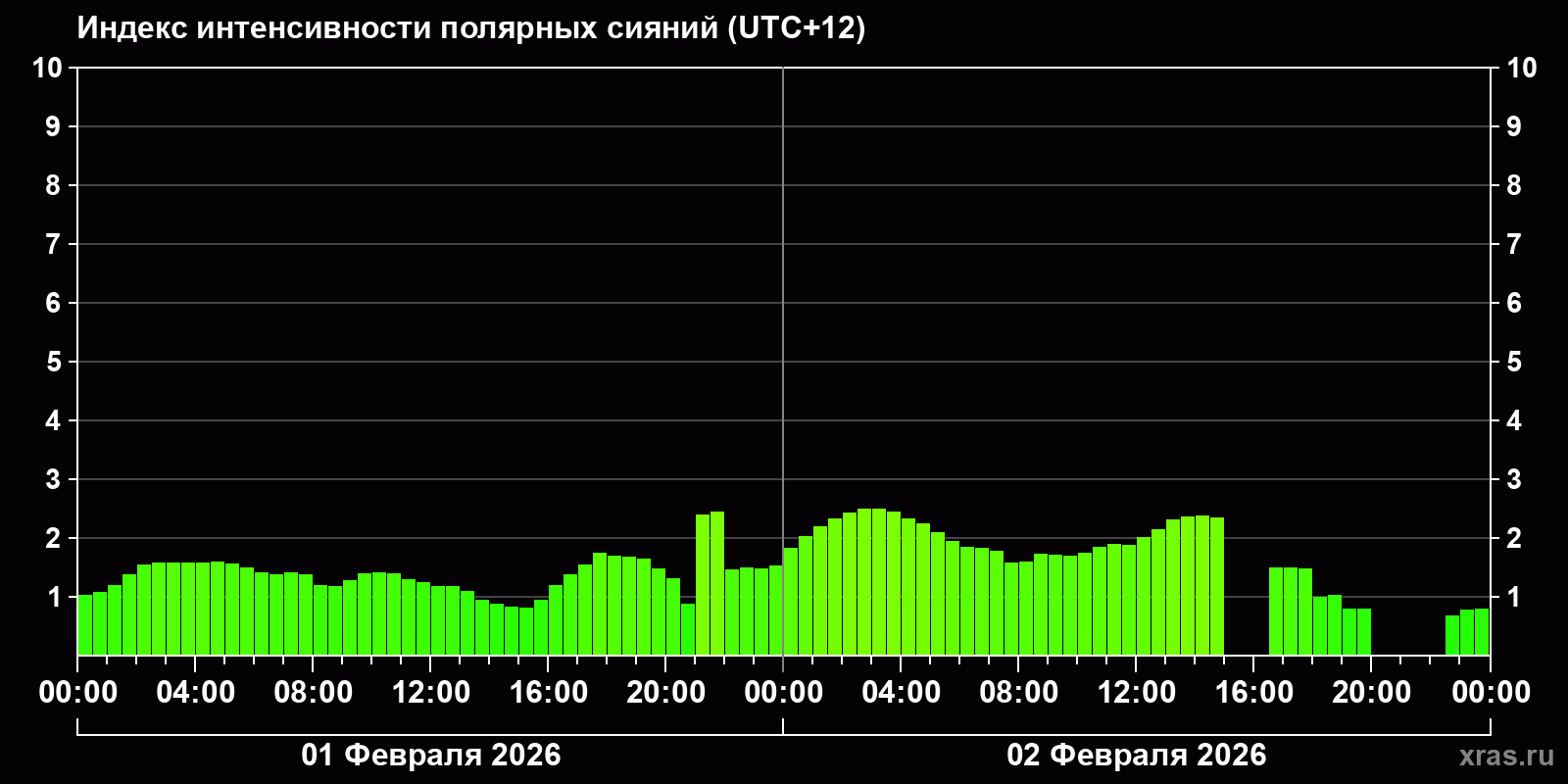 Изменения индекса интенсивности полярных сияний с 2026-02-01 по 2026-02-02 по местному времени
