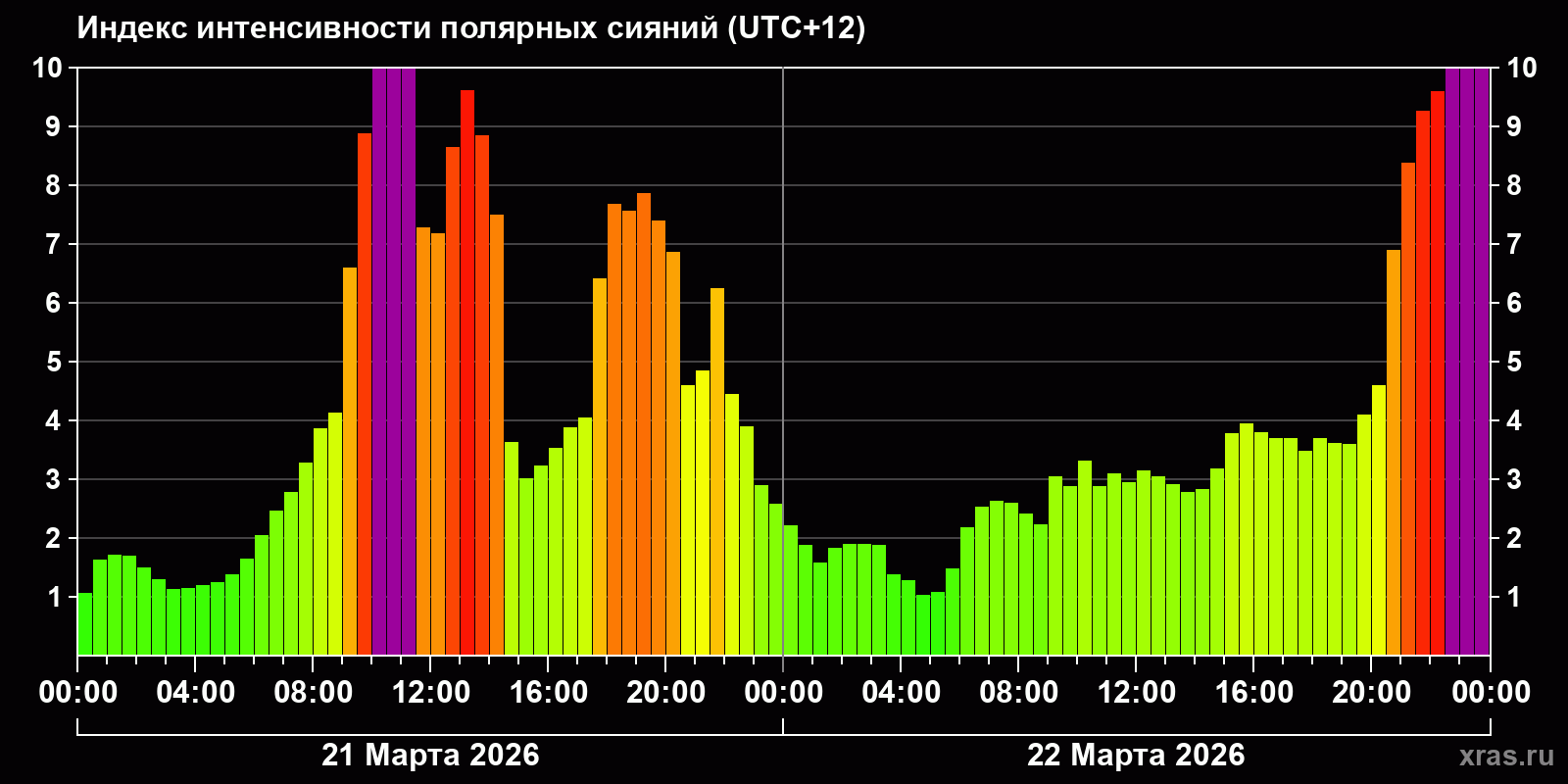 Изменения индекса интенсивности полярных сияний с 2026-03-21 по 2026-03-22 по местному времени