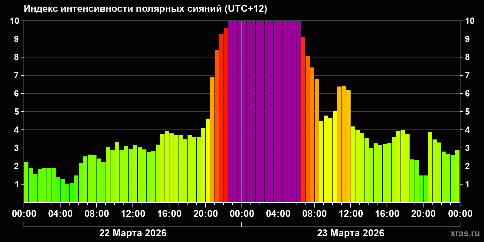 Изменения индекса интенсивности полярных сияний с 2026-03-22 по 2026-03-23 по местному времени