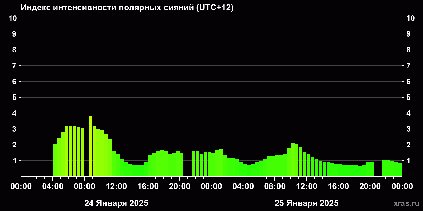 Изменения индекса интенсивности полярных сияний с 2025-01-24 по 2025-01-25 по местному времени