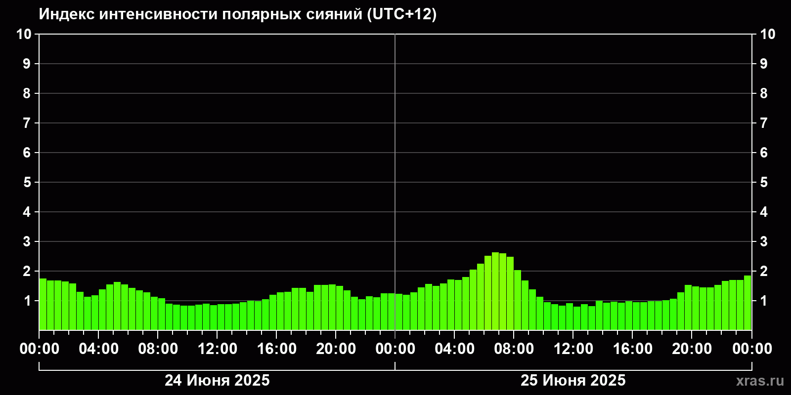 Изменения индекса интенсивности полярных сияний с 2025-06-25 по 2025-06-26 по местному времени