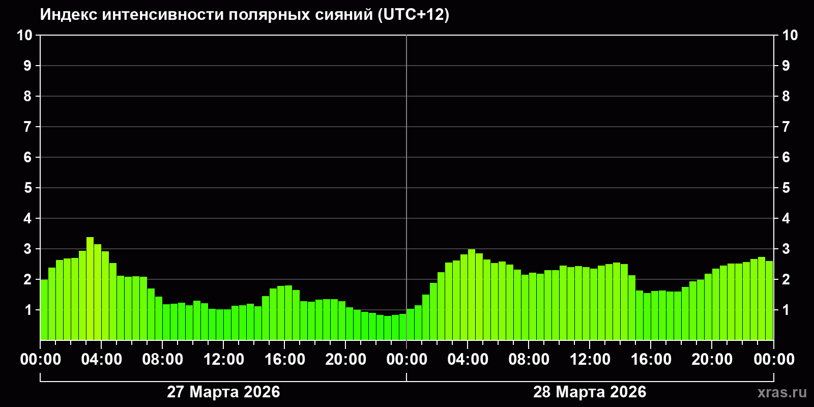Изменения индекса интенсивности полярных сияний с 2026-03-27 по 2026-03-28 по местному времени