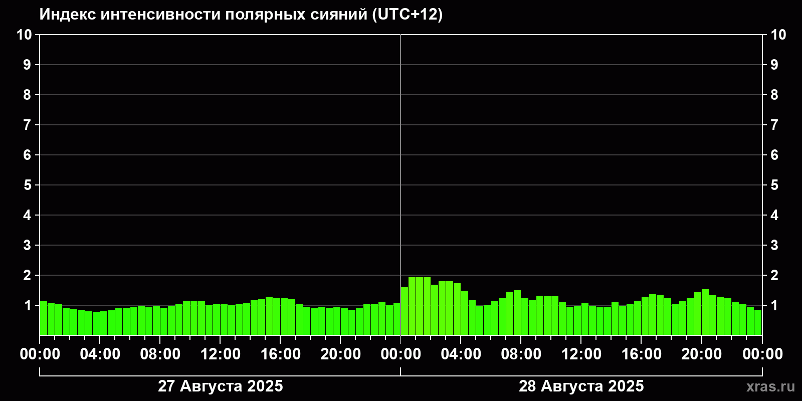 Изменения индекса интенсивности полярных сияний с 2025-08-28 по 2025-08-29 по местному времени