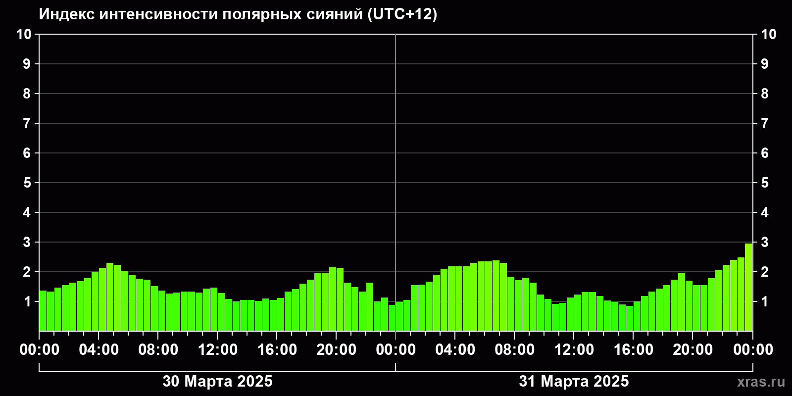 Изменения индекса интенсивности полярных сияний с 2025-03-31 по 2025-04-01 по местному времени