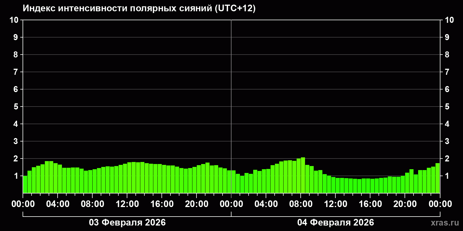Изменения индекса интенсивности полярных сияний с 2026-02-03 по 2026-02-04 по местному времени