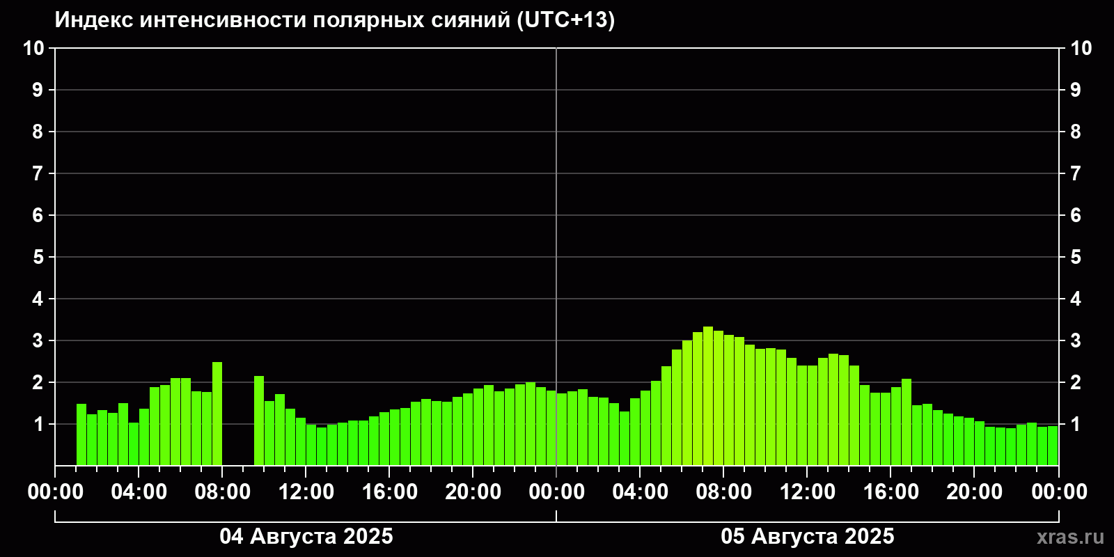 Изменения индекса интенсивности полярных сияний с 2025-08-04 по 2025-08-05 по местному времени