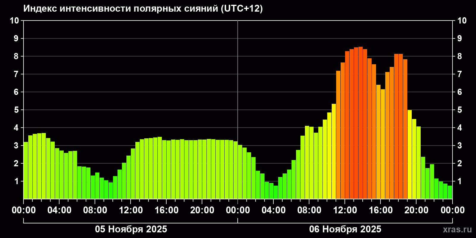 Изменения индекса интенсивности полярных сияний с 2025-11-05 по 2025-11-06 по местному времени