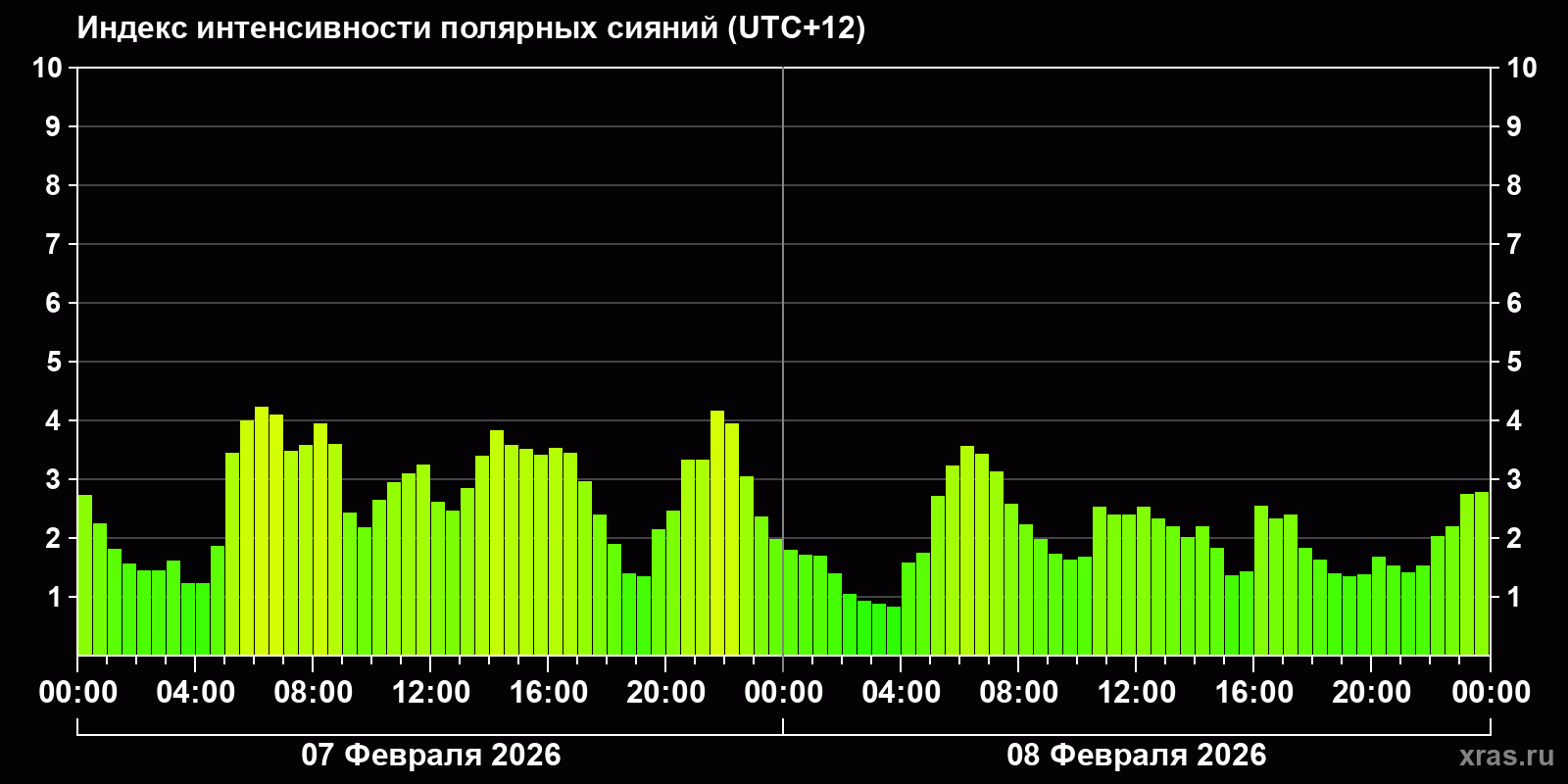 Изменения индекса интенсивности полярных сияний с 2026-02-07 по 2026-02-08 по местному времени