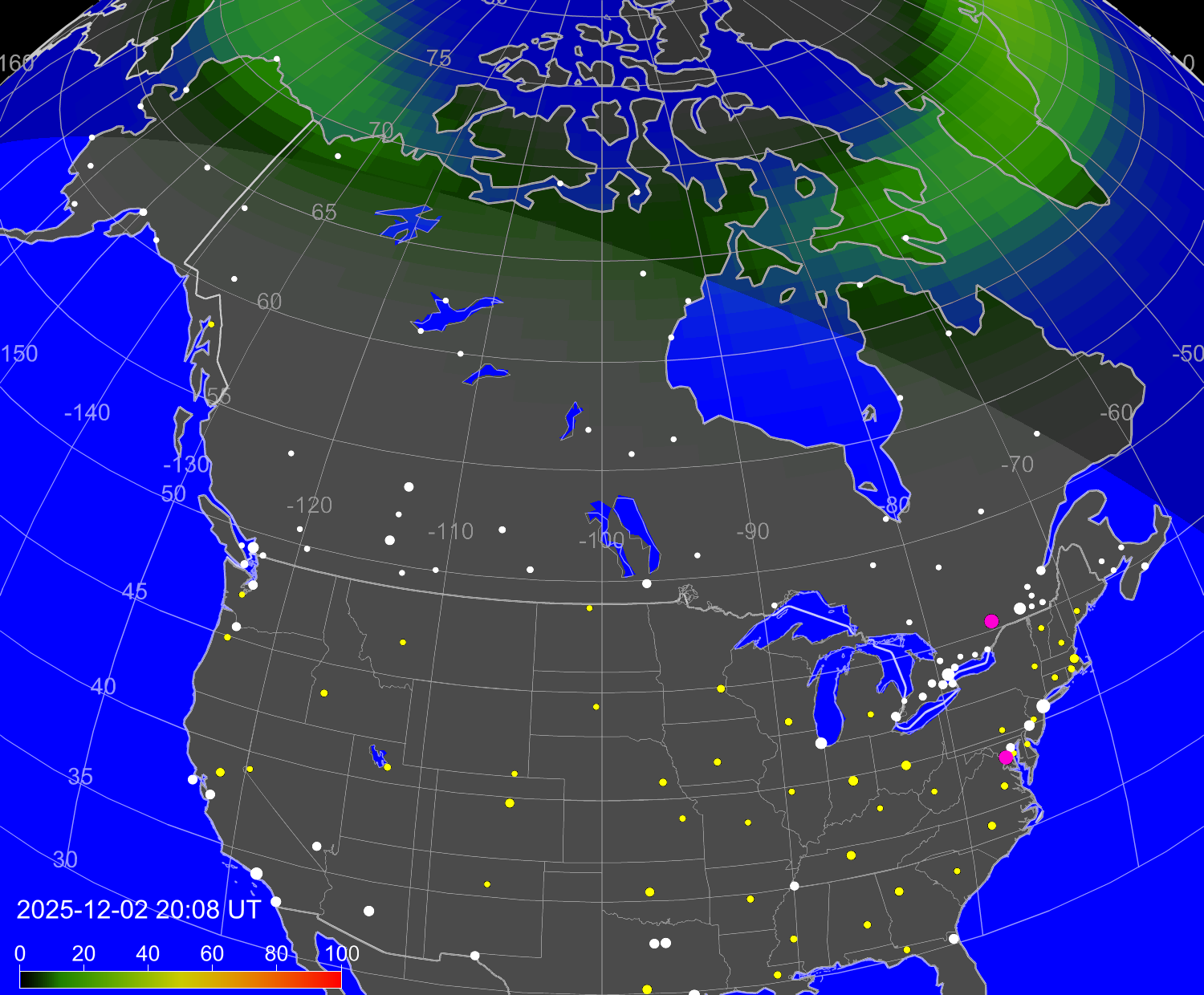 Изменения и часовой прогноз индекса интенсивности полярных сияний с 2025-11-30 по 2025-12-01