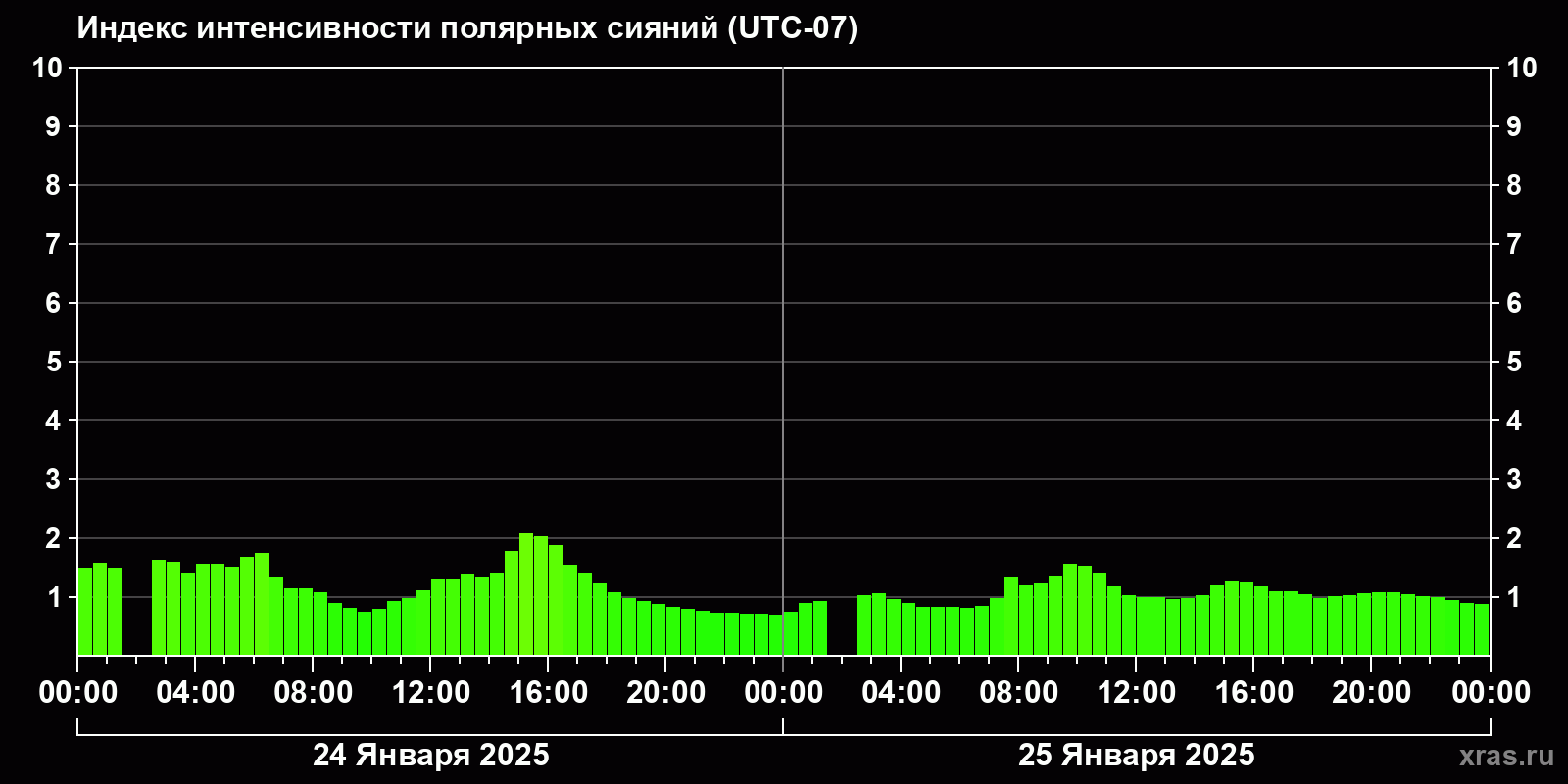 Изменения индекса интенсивности полярных сияний с 2025-01-24 по 2025-01-25 по местному времени