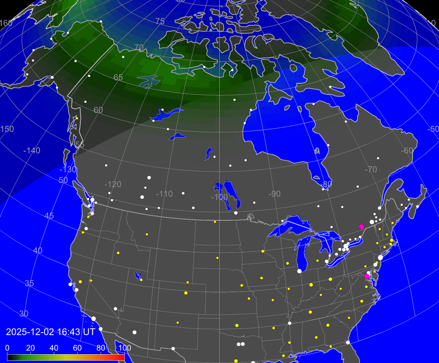 Изменения и часовой прогноз индекса интенсивности полярных сияний с 2025-11-30 по 2025-12-01
