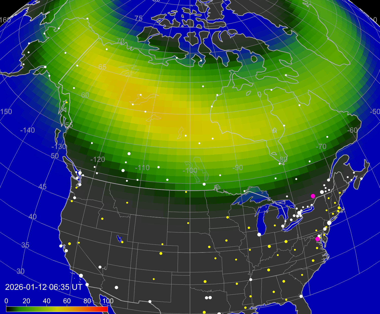 Изменения и часовой прогноз индекса интенсивности полярных сияний с 2026-01-11 по 2026-01-12