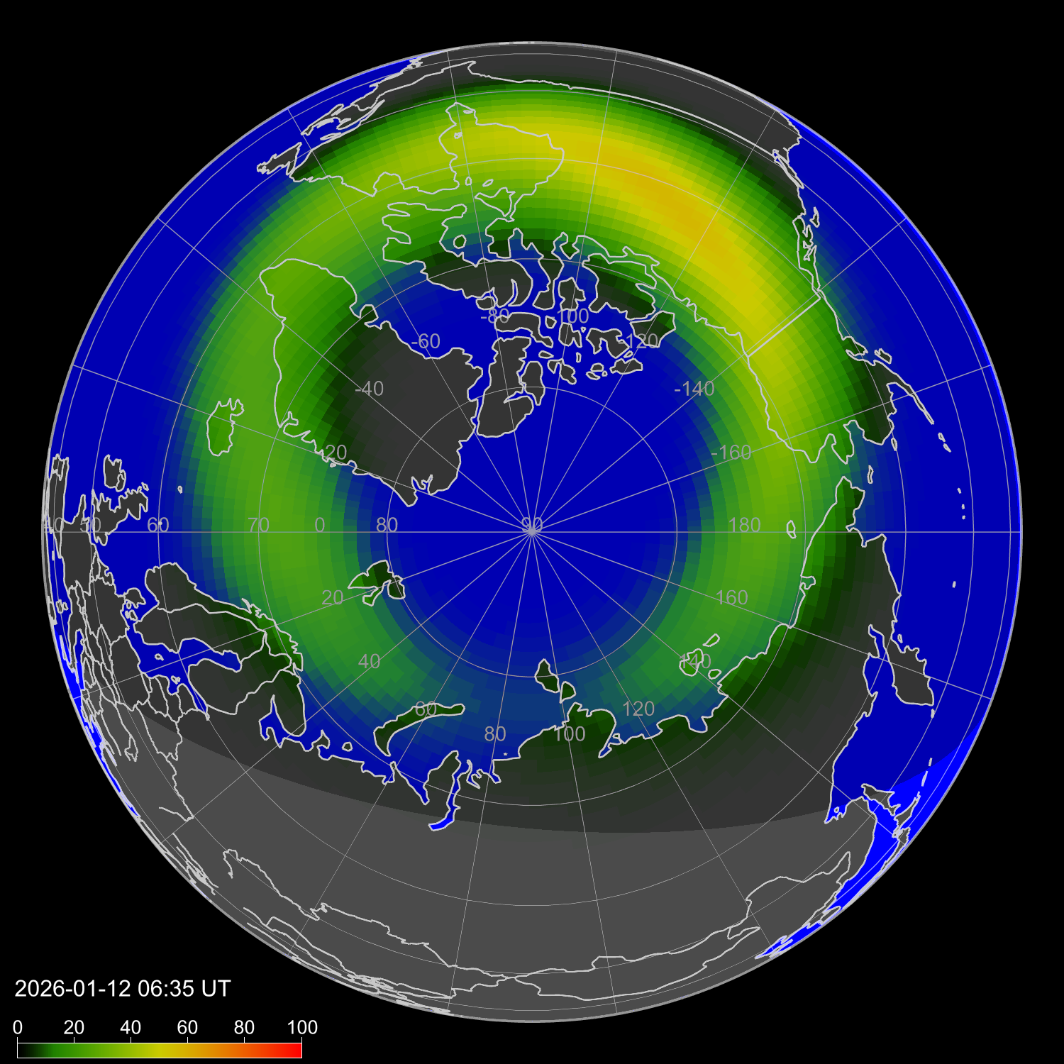 Индекс интенсивности полярных сияний и теоретически возможная широта наблюдений для ночного времени в западном полушарии