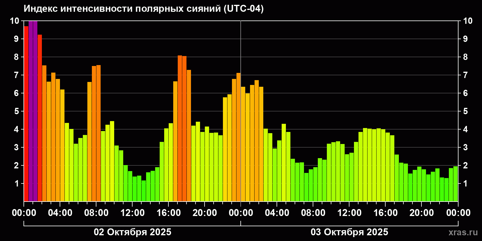 Изменения индекса интенсивности полярных сияний с 2025-10-02 по 2025-10-03 по местному времени