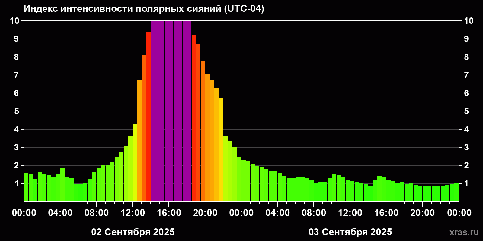 Изменения индекса интенсивности полярных сияний с 2025-09-02 по 2025-09-03 по местному времени