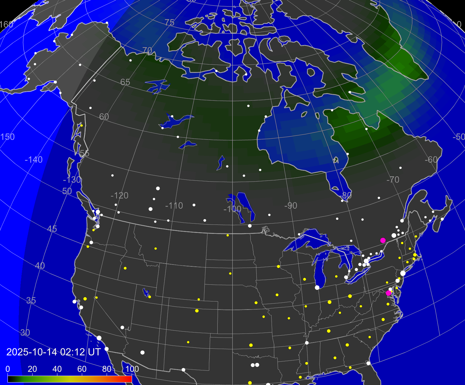 Изменения и часовой прогноз индекса интенсивности полярных сияний с 2025-10-12 по 2025-10-13