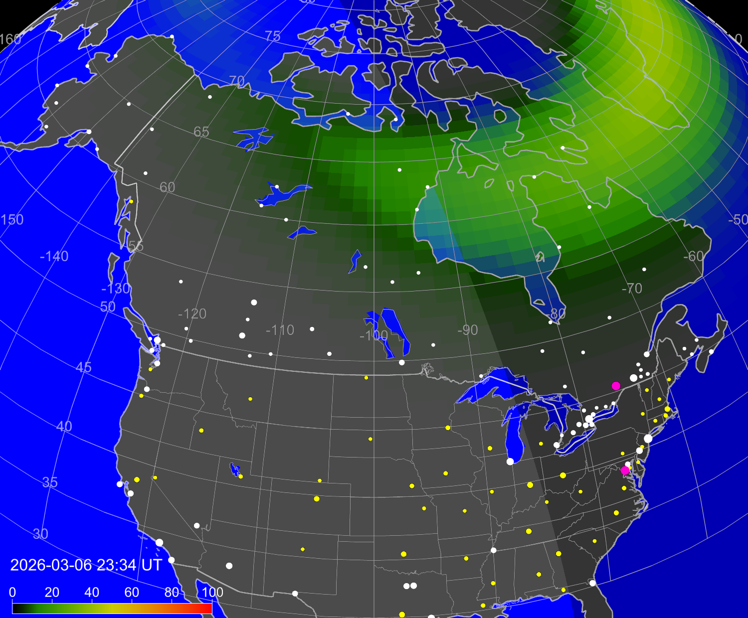 Изменения и часовой прогноз индекса интенсивности полярных сияний с 2026-03-05 по 2026-03-06