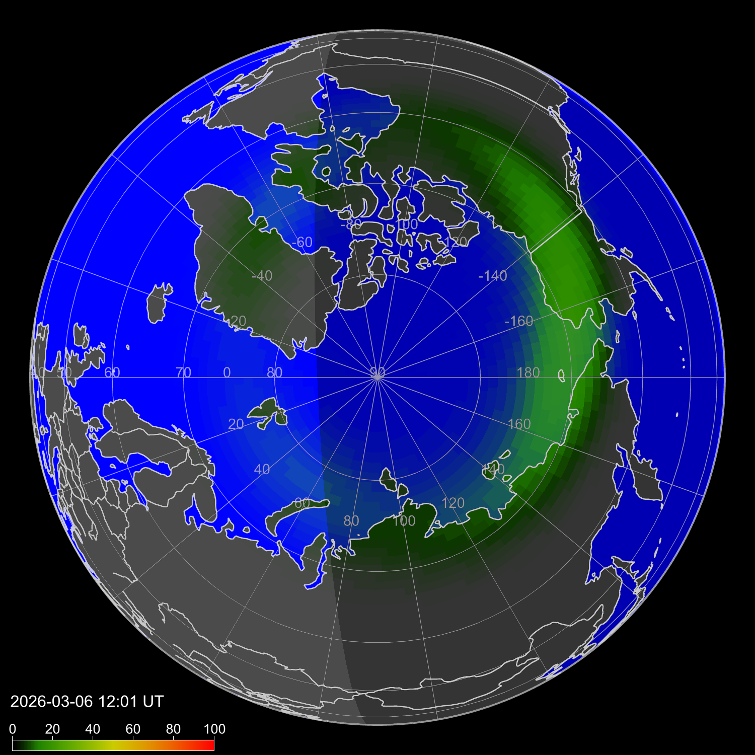 Индекс интенсивности полярных сияний и теоретически возможная широта наблюдений для ночного времени в западном полушарии