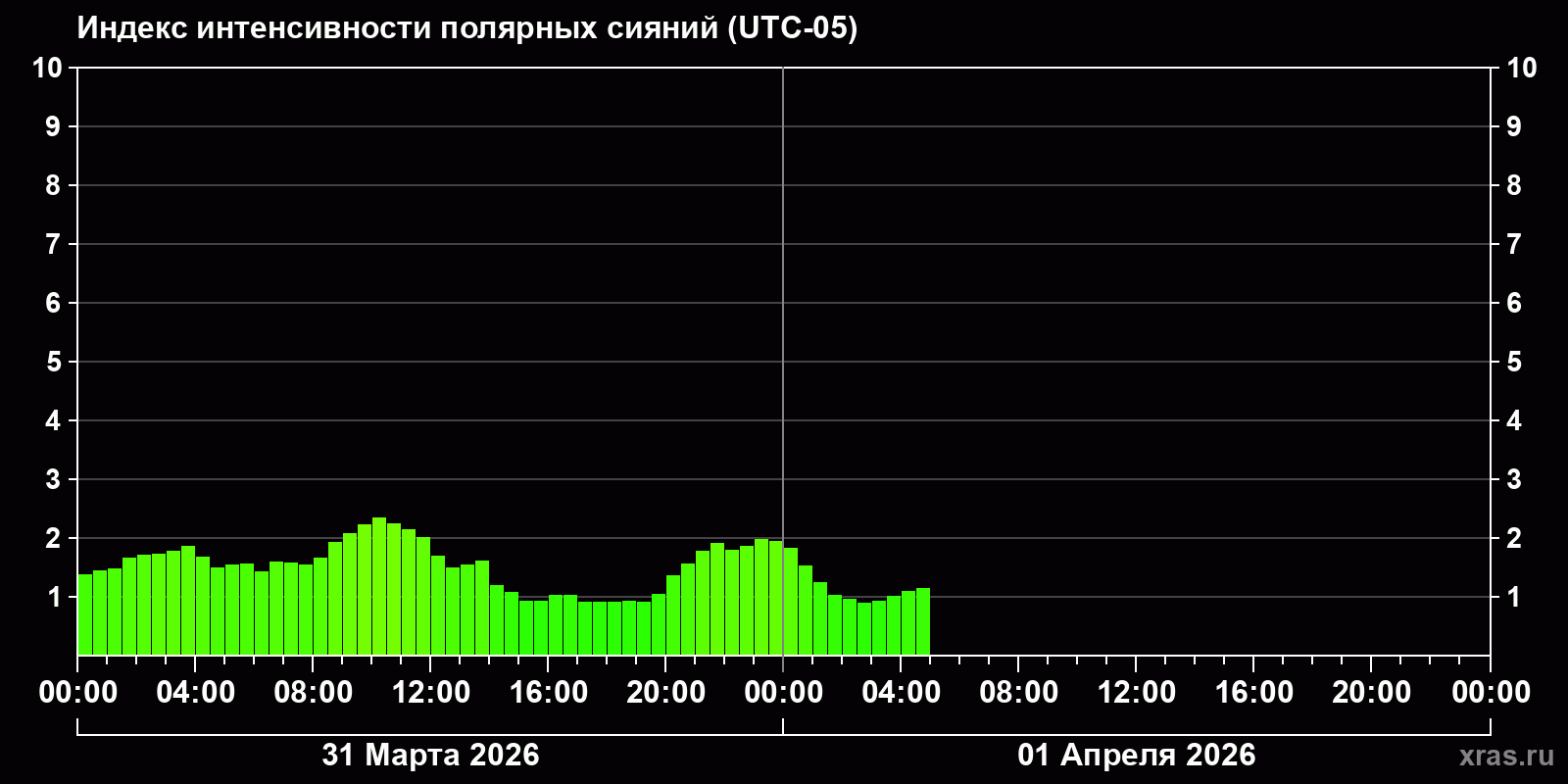 Изменения индекса интенсивности полярных сияний с 2026-03-31 по 2026-04-01 по местному времени