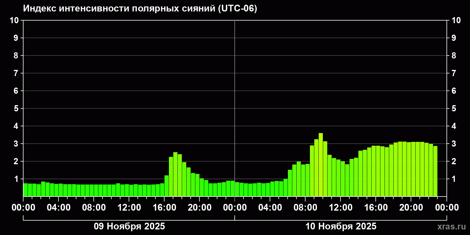 Изменения индекса интенсивности полярных сияний с 2025-11-09 по 2025-11-10 по местному времени