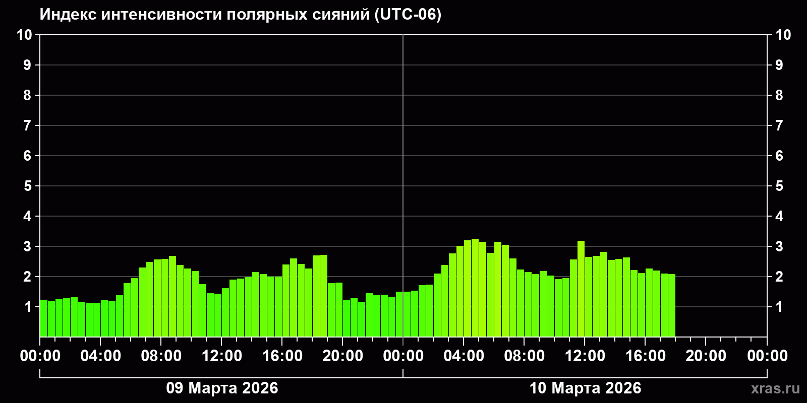 Изменения индекса интенсивности полярных сияний с 2026-03-09 по 2026-03-10 по местному времени