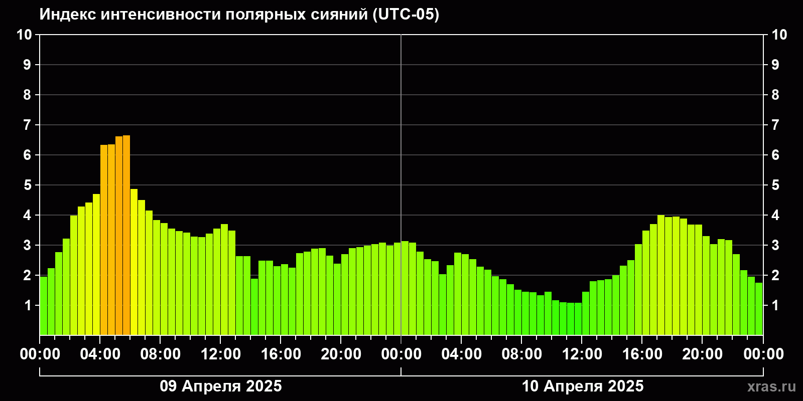 Изменения индекса интенсивности полярных сияний с 2025-04-09 по 2025-04-10 по местному времени