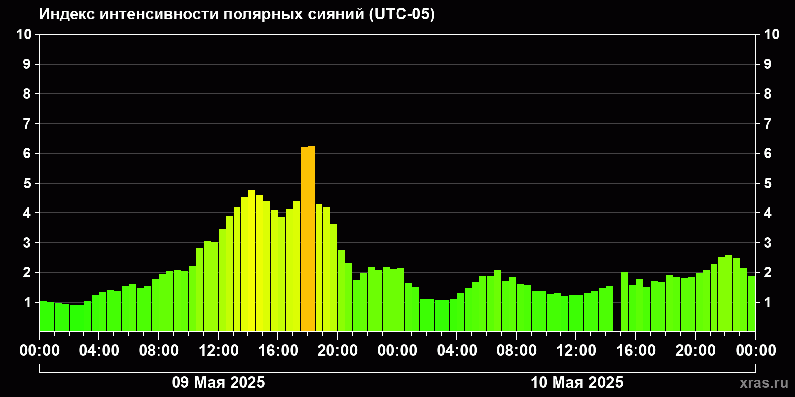 Изменения индекса интенсивности полярных сияний с 2025-05-09 по 2025-05-10 по местному времени