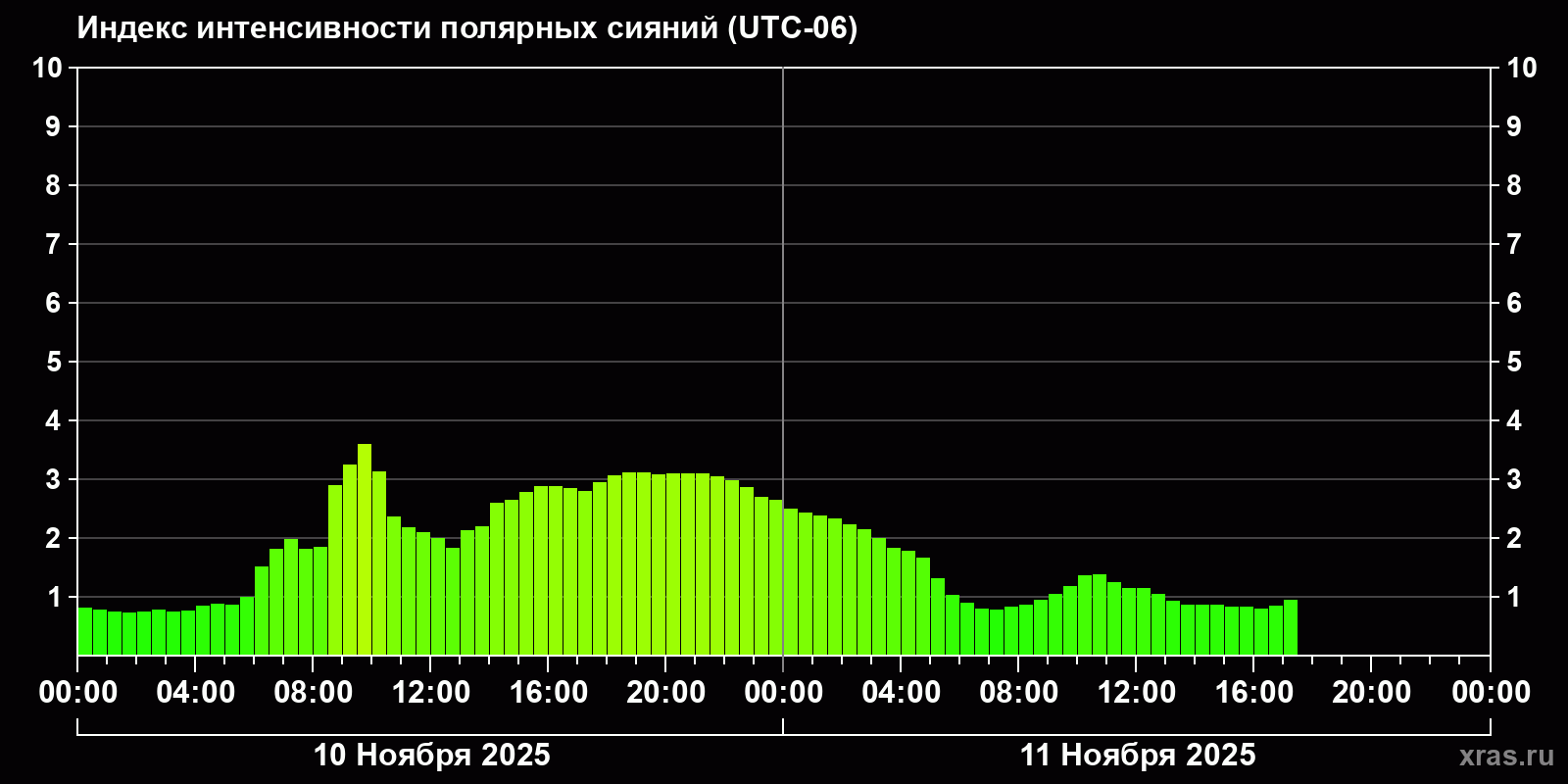 Изменения индекса интенсивности полярных сияний с 2025-11-10 по 2025-11-11 по местному времени