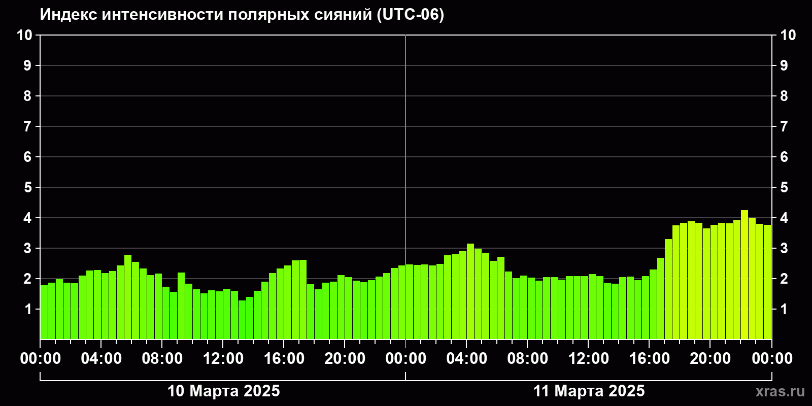 Изменения индекса интенсивности полярных сияний с 2025-03-10 по 2025-03-11 по местному времени