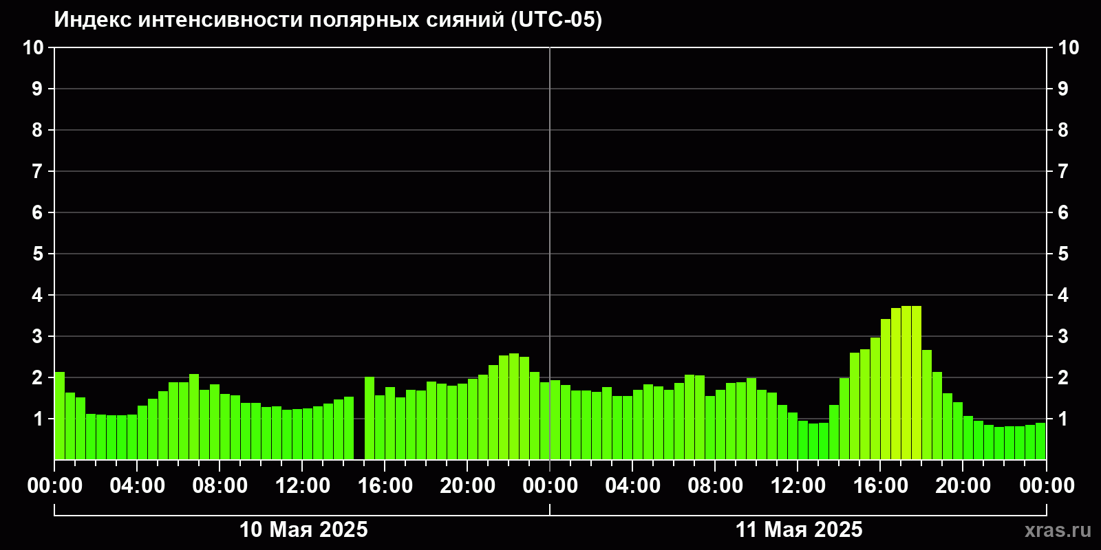 Изменения индекса интенсивности полярных сияний с 2025-05-10 по 2025-05-11 по местному времени