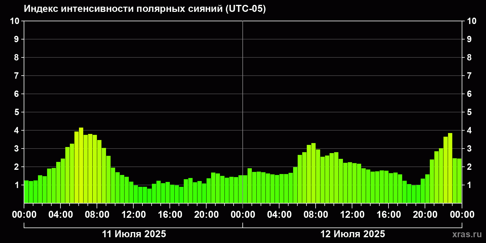 Изменения индекса интенсивности полярных сияний с 2025-07-11 по 2025-07-12 по местному времени