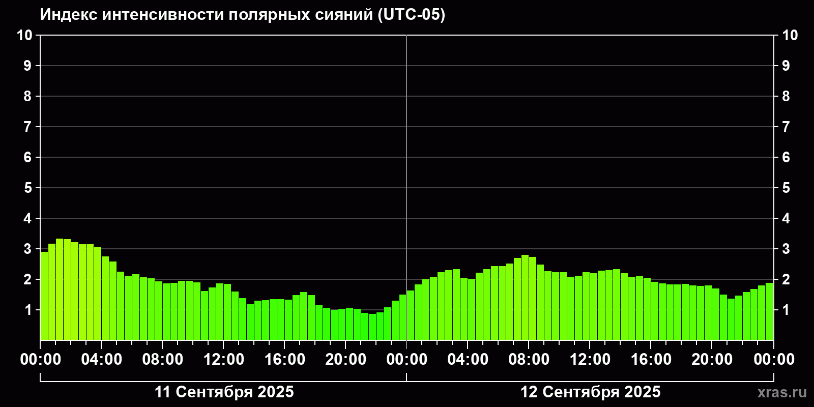 Изменения индекса интенсивности полярных сияний с 2025-09-11 по 2025-09-12 по местному времени