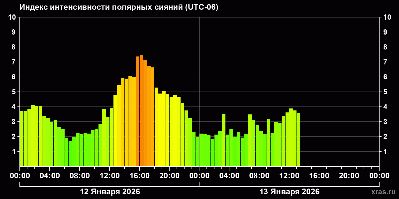 Изменения индекса интенсивности полярных сияний с 2026-01-12 по 2026-01-13 по местному времени