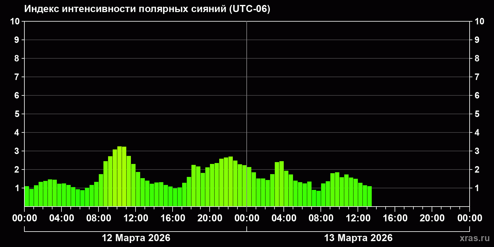 Изменения индекса интенсивности полярных сияний с 2026-03-12 по 2026-03-13 по местному времени