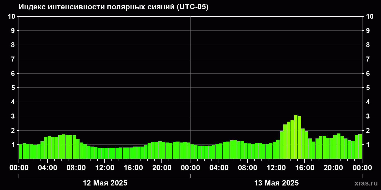 Изменения индекса интенсивности полярных сияний с 2025-05-12 по 2025-05-13 по местному времени