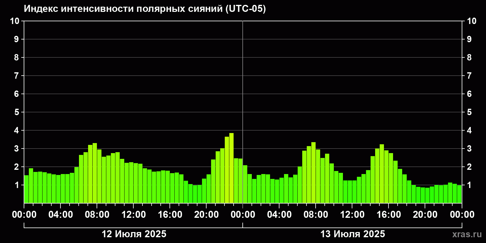 Изменения индекса интенсивности полярных сияний с 2025-07-12 по 2025-07-13 по местному времени