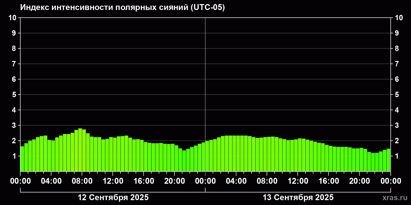 Изменения индекса интенсивности полярных сияний с 2025-09-12 по 2025-09-13 по местному времени