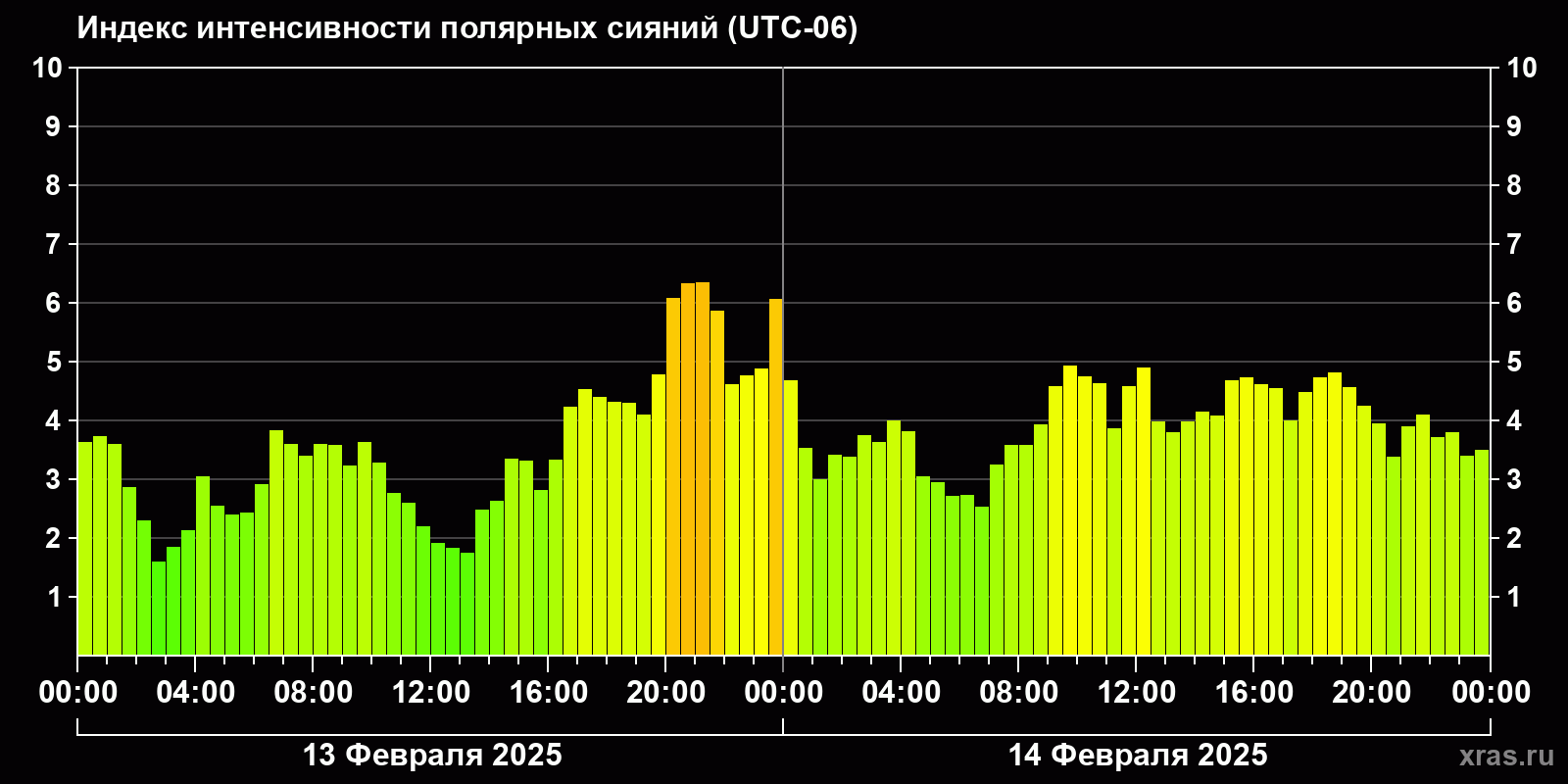Изменения индекса интенсивности полярных сияний с 2025-02-13 по 2025-02-14 по местному времени