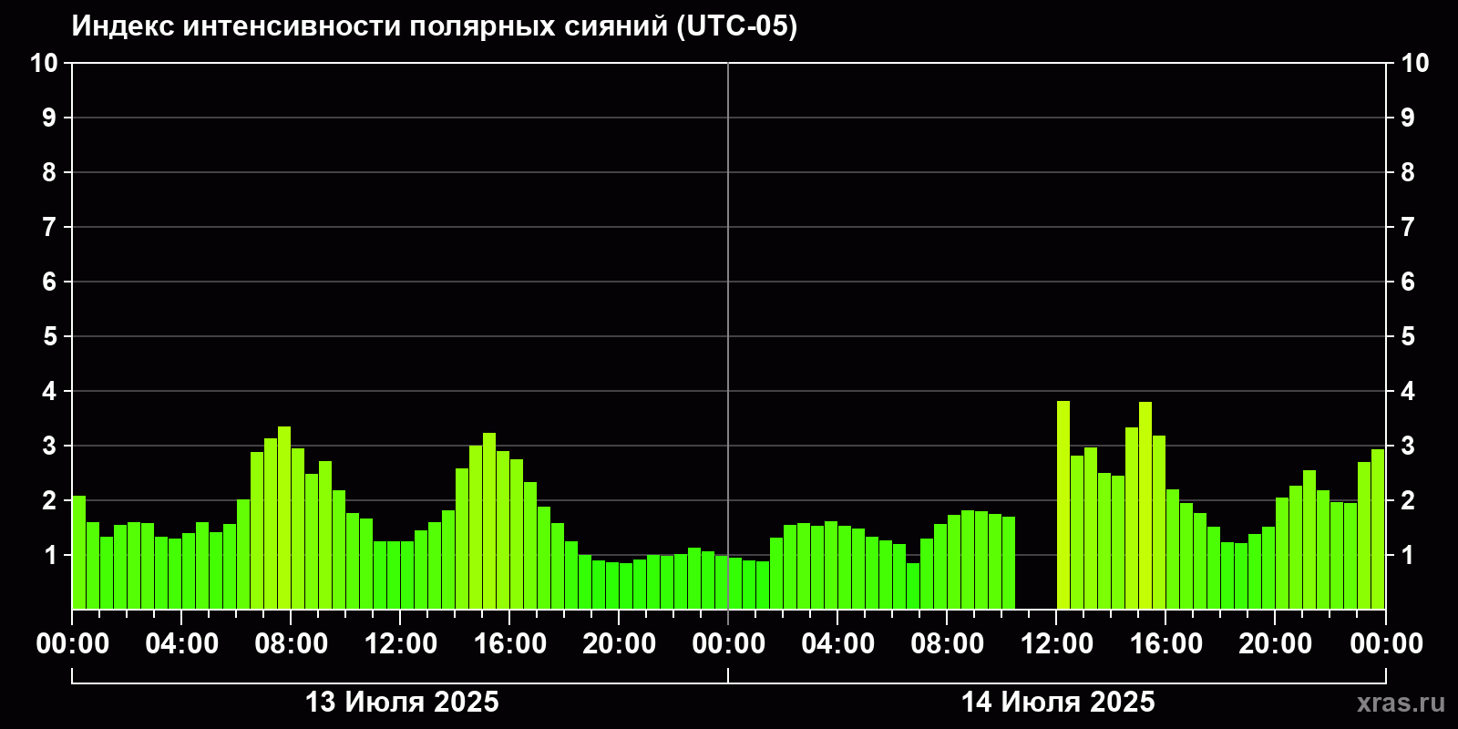 Изменения индекса интенсивности полярных сияний с 2025-07-13 по 2025-07-14 по местному времени