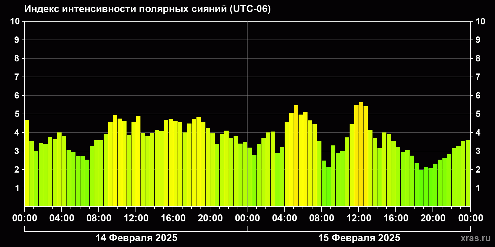 Изменения индекса интенсивности полярных сияний с 2025-02-14 по 2025-02-15 по местному времени