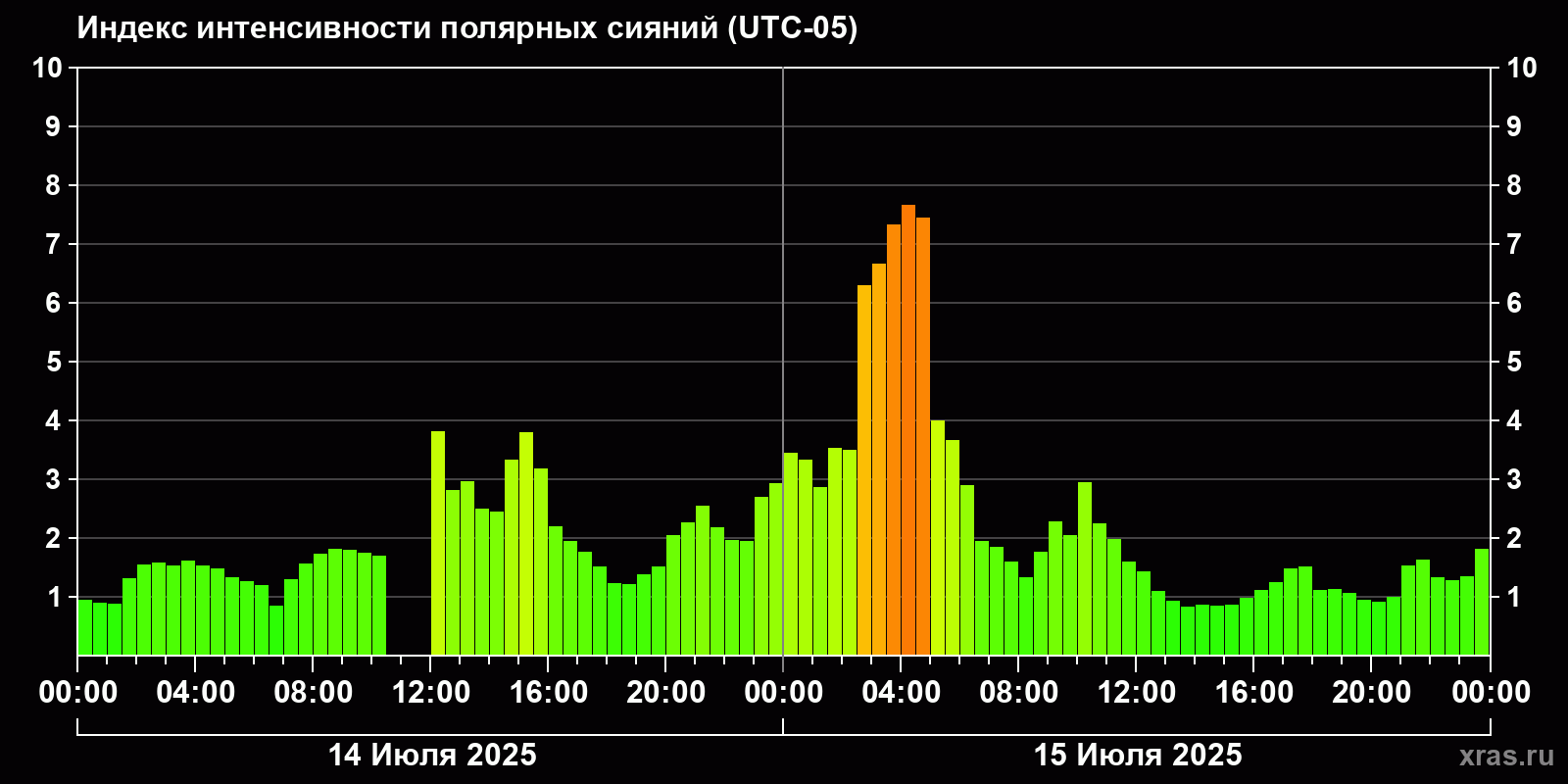 Изменения индекса интенсивности полярных сияний с 2025-07-14 по 2025-07-15 по местному времени