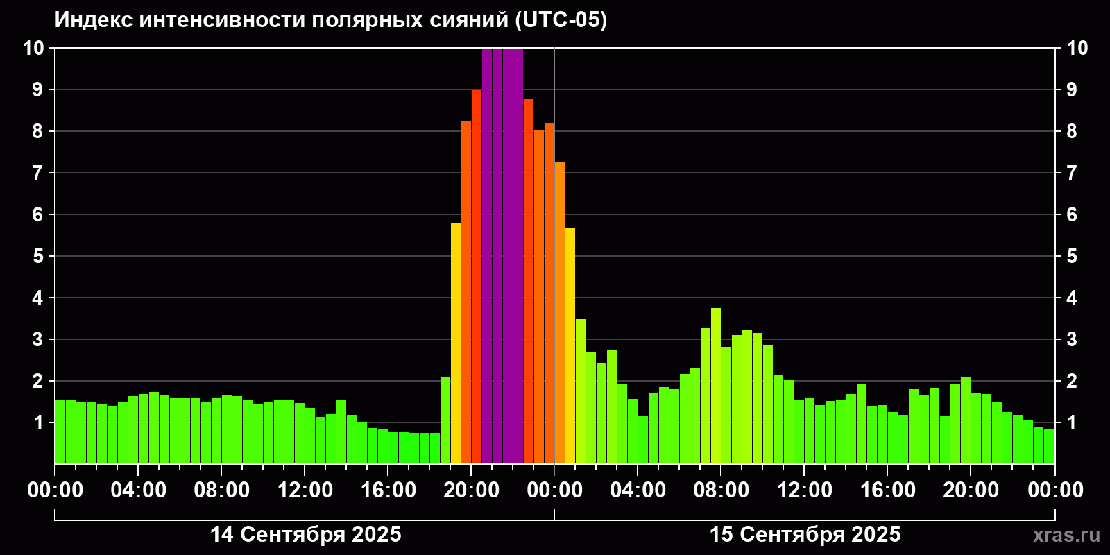 Изменения индекса интенсивности полярных сияний с 2025-09-14 по 2025-09-15 по местному времени