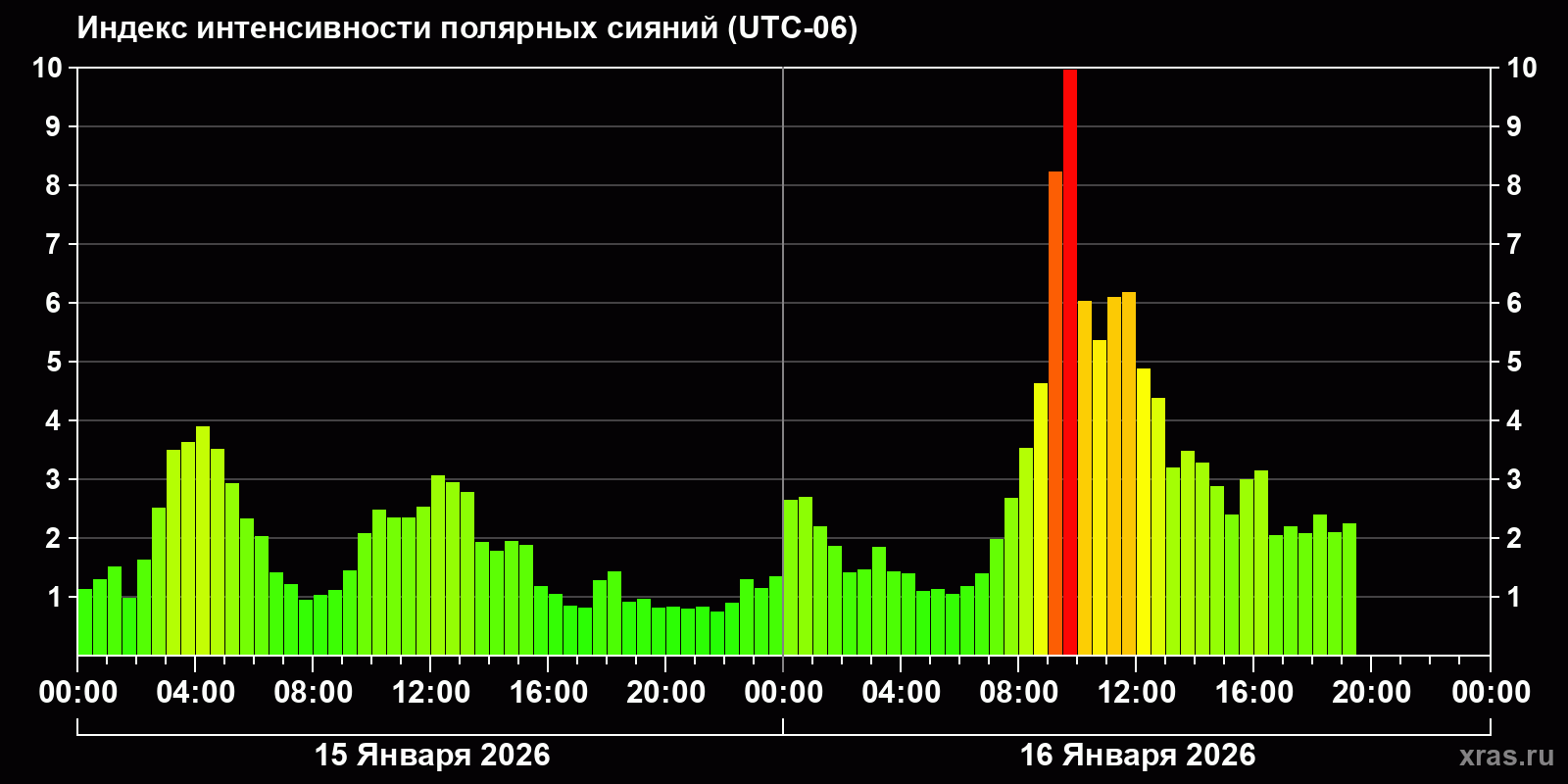 Изменения индекса интенсивности полярных сияний с 2026-01-15 по 2026-01-16 по местному времени